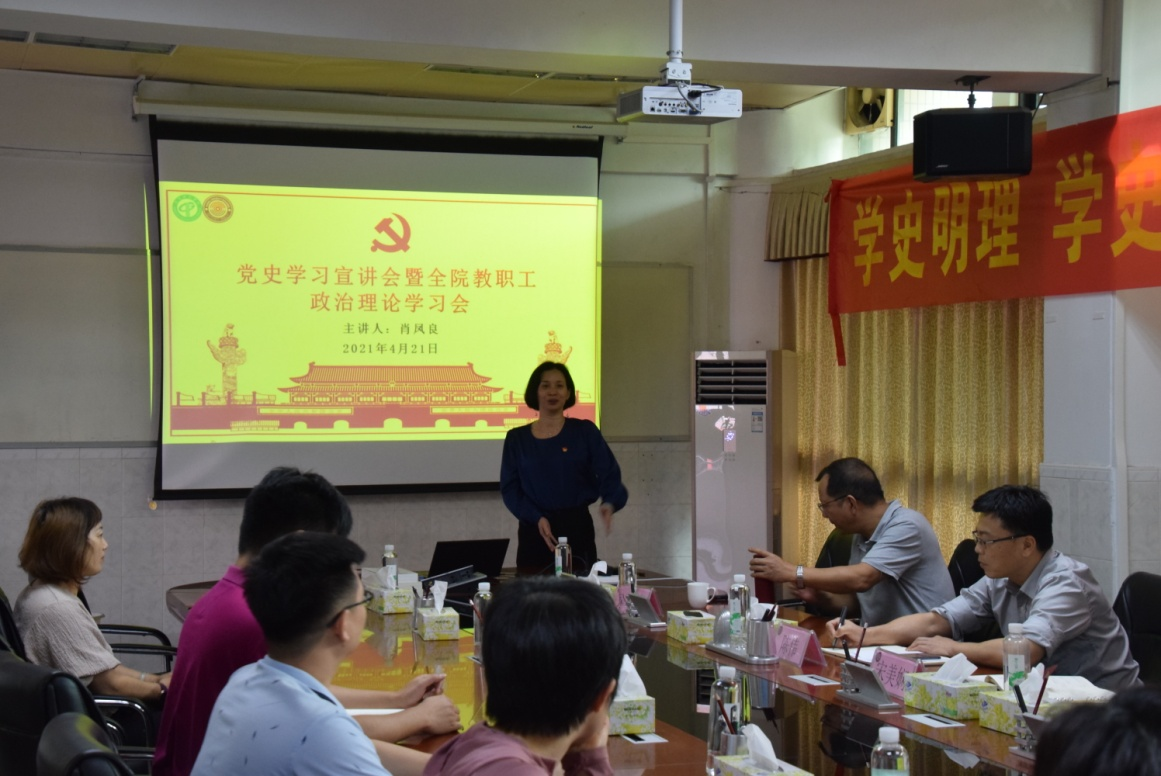 为深入学习贯彻习近平总书记在党史学习教育动员大会上的重要讲话精神,扎实推进党史学习教育,根据公司党委党史学习教育领导小组印发的《关于组织开展党史专题宣讲工作的通知》(莞工学组发〔2021〕1号),4月21日,tyc41183太阳成直属党支部在公司302会议室召开了党史学习宣讲会暨教职工政治理论学习会。会议由直属党支部书记宋美娴主持,公司马克思主义公司肖凤良教授作专题宣讲,公司教职工参加了会议。