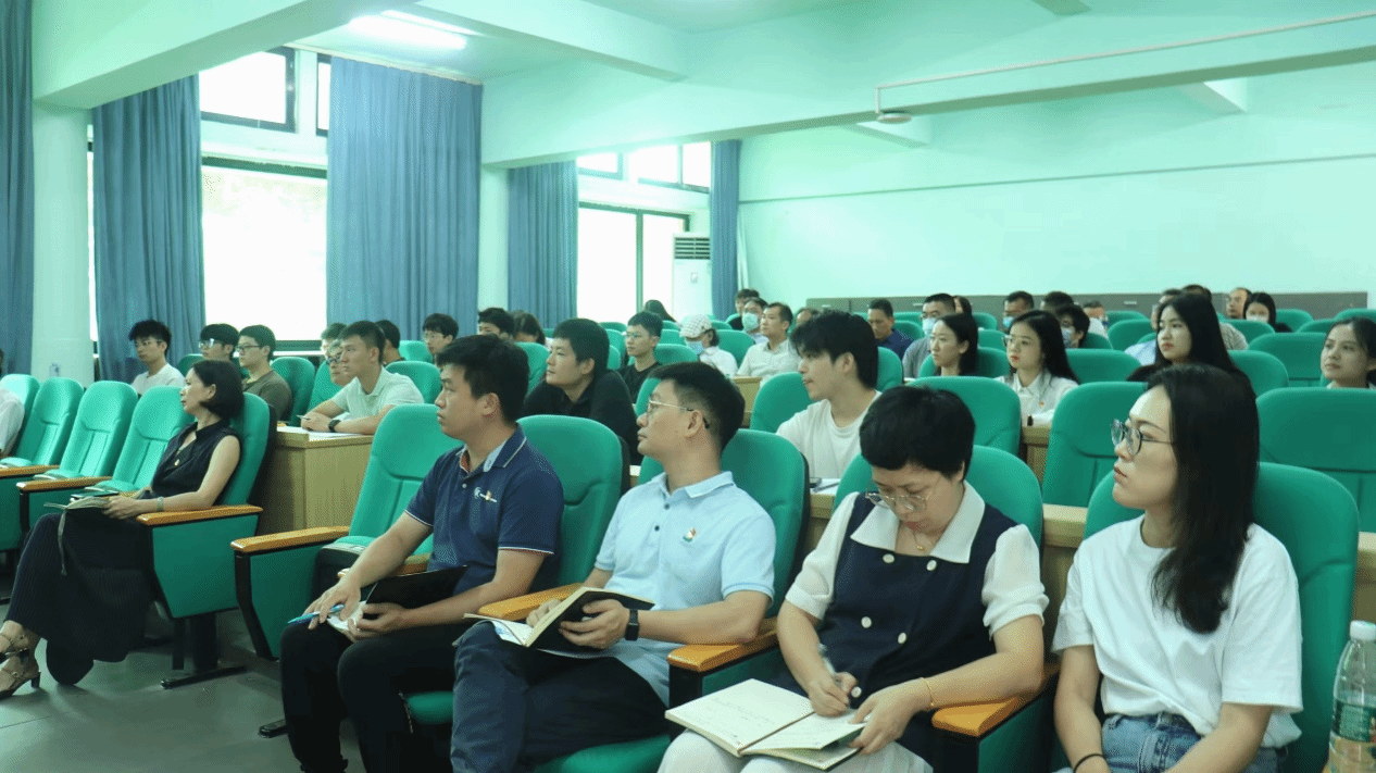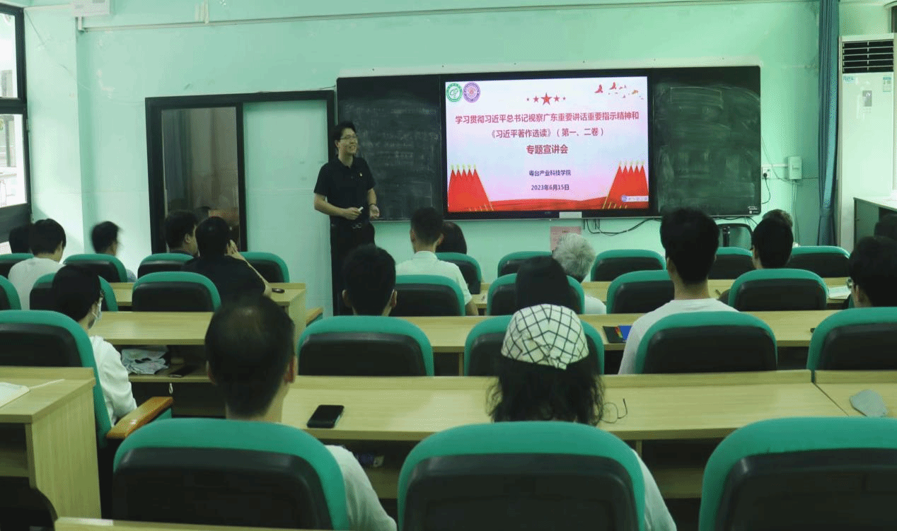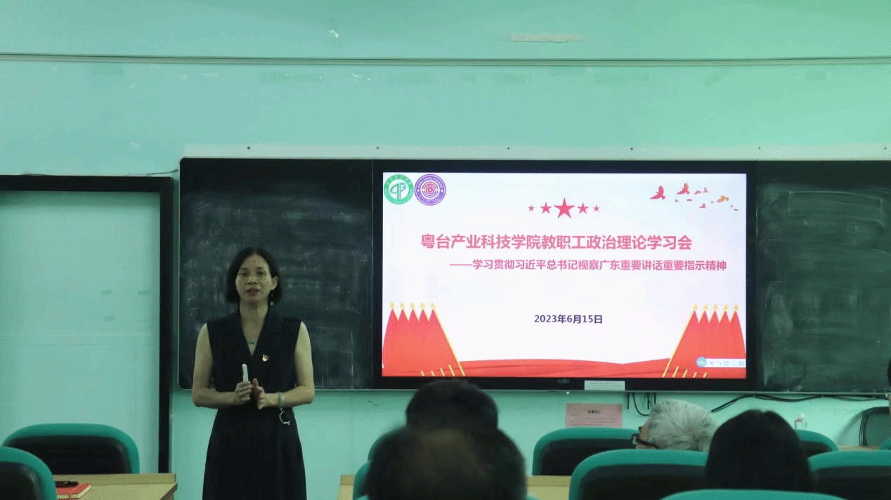 为推动学习贯彻习近平新时代中国特色社会主义思想主题教育走深走实,6月15日,粤台公司党委在莞城校区实验楼305多功能教室开展“学习贯彻习近平总书记视察广东重要讲话重要指示精神和《习近平著作选读》第一卷、第二卷”专题宣讲会。公司全体教职工、师生党员、员工代表等参加了专题学习,宣讲会由公司党委书记宋美娴主持,马克思主义公司马冀群博士主讲。