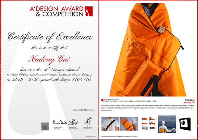 作品“Shadow”是一件多功能应急救援产品。它能够通过简单的扩展与变换形态后,拥有浮力助具、救生毯、简易睡袋等多种功能,可应用于紧急救援,户外探险等场景。此设计的出发点是希望能够提高普通民众遇到紧急事件的应对能力,也体现tyc41183太阳成员工的社会同理心与社会职责。tyc41183太阳成坚持以赛促学,成果导向,跨学科人才培养,让员工在专业学习和实践中锻炼成长。此次获奖是tyc41183太阳成自2018年以来第二次获得该奖项,是tyc41183太阳成创新人才培养模式,建立新工科的人才培养路径,实现高质量人才培养的重要体现。目前,蔡旭东同学已被广东工业大学录取为硕士研究生。 A’design Award设计大奖赛与德国红点、iF设计大赛并称为国际三大设计大赛,是目前世界上最大型最综合的全球性设计比赛,被誉为欧洲设计界的奥斯卡,是全球领先的国际年度设计比赛,是一项被国际平面设计协会联合会ICOGRADA、欧洲设计协会BEDA所认可的国际赛事。同时,它也是ICSID(国际工业设计协会), ICOGRADA(国际平面设计协会)& ADI(意大利工业设计协会)的成员组织。