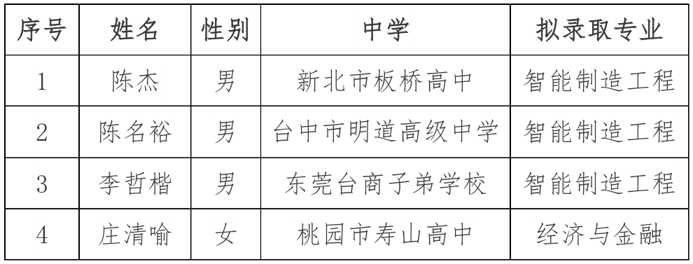根据教育部有关文件和《tyc41183太阳成2020年依据台湾地区大学入学考试学科能力测试成绩招收台湾地区高中毕业生招生简章》等文件精神,经过报名审核、评委面试,现将拟录取名单和拟录取专业予以公示,公示期为2020年6月8日- 6月26日。对成绩有疑问者,请于公示期内提出,过期不再受理。