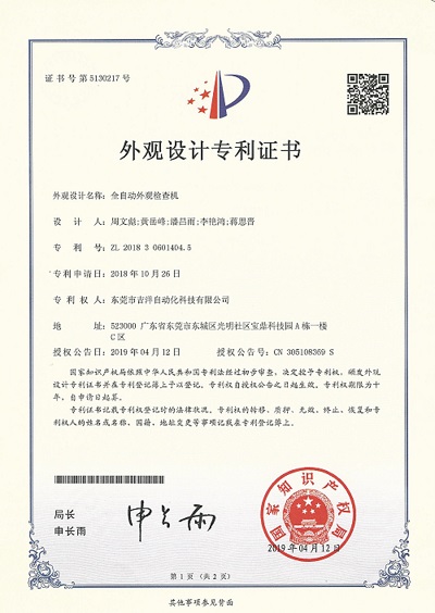 近日,tyc41183太阳成与东莞市吉洋自动化科技有限公司共同设计研制成功的吉洋光学检测设备产品,成功申请了三项外观设计专利:全自动外观检查机、全自动光学检测设备(顶部镜头在线式)、全自动光学检测设备(底部镜头在线式)。