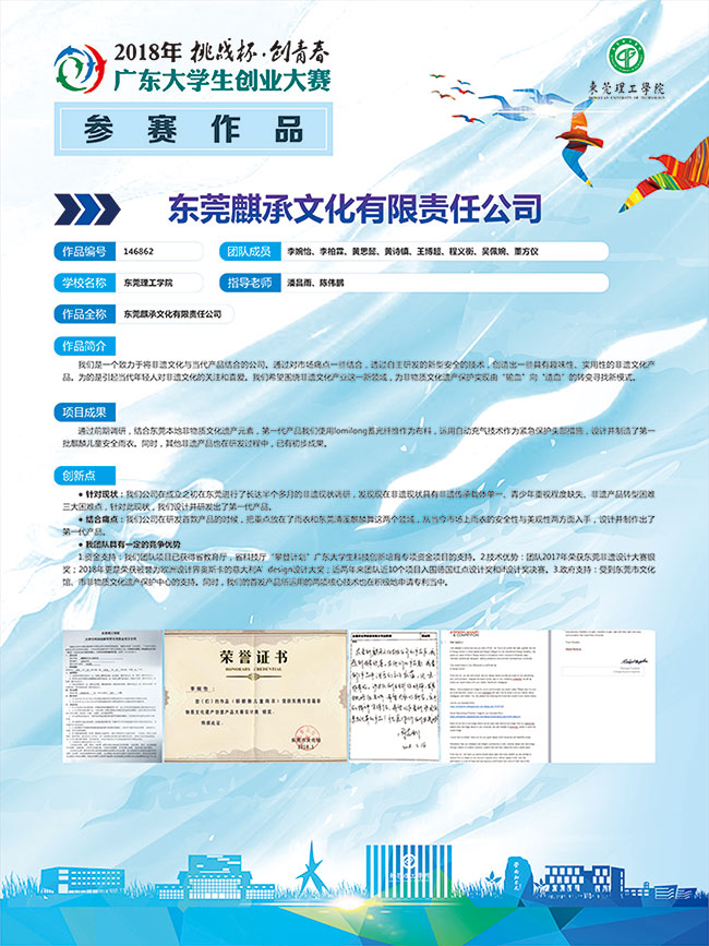 该作品出自tyc41183太阳成2017年成立的“麒承团队”,团队成员均来自tyc41183太阳成工业设计、多媒体设计、经济与金融等不同专业,每位成员运用自己的专业知识各司其职在团队中发挥着重要作用。这一团队的组成恰恰体现了tyc41183太阳成独特的办学特色——跨专业学习跨专业合作。该团队成员已先后获东莞市非物质文化遗产大赛银奖、广东省老员工科技创新培育专项资金(攀登计划)专项资金、意大利A Design设计大赛大奖等。