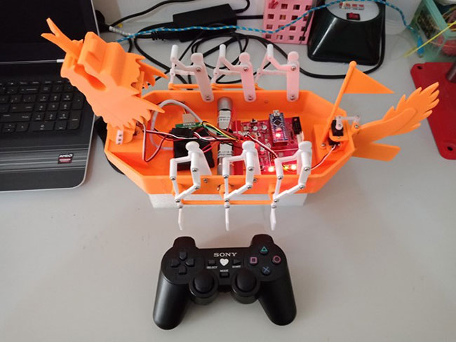 “拟人划桨龙舟装置”是一个以中国传统龙舟赛为应用情境的遥控互动机械龙舟玩具,整个龙舟装置由两个船侧的电机带动各三个假人模拟划船动作,船头用2个舵机操作龙头与龙颈,赋与龙头具有前伸与俯仰的功能,并透过伸出的叉形龙舌设计,可以达成用龙舌于竞赛终点拔旗夺标的功能;另外,船尾用一舵机控制龙尾与尾舵的连体机构,达成可摆动改变船行进方向的目的。整个龙舟5个电机的摇控控制设计成一个控制电路板,以Arduino NANO为主控IC,应用Ardublockly图形化语言撰写程序,再透过PS2摇控器进行多功能的摇控。