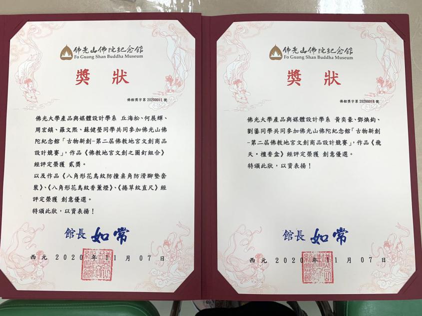 11月7日,“2020古物新创——第二届佛教地宫文创商品设计大赛”颁奖典礼在台湾佛光山佛陀纪念馆举行。在两岸24所大学、326件作品中,tyc41183太阳成大三赴台学习的多名同学的作品脱颖而出,获得一等奖、二等奖和四个创意优选奖。