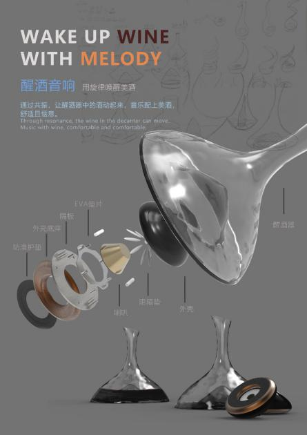 获奖作品《醒酒音响》是一款旨在让音乐与美酒搭配在一起,营造浪漫而有情调的氛围产品。主要是通过音响发声所产生的震撼,让醒酒器当中的酒震动起来,不仅能增加与空气的接触面,减少醒酒时间;还能产生液体波动的效果。在听觉上感受美妙音乐的同时,也能从视觉与味觉上品味美酒的醇厚与芳香。